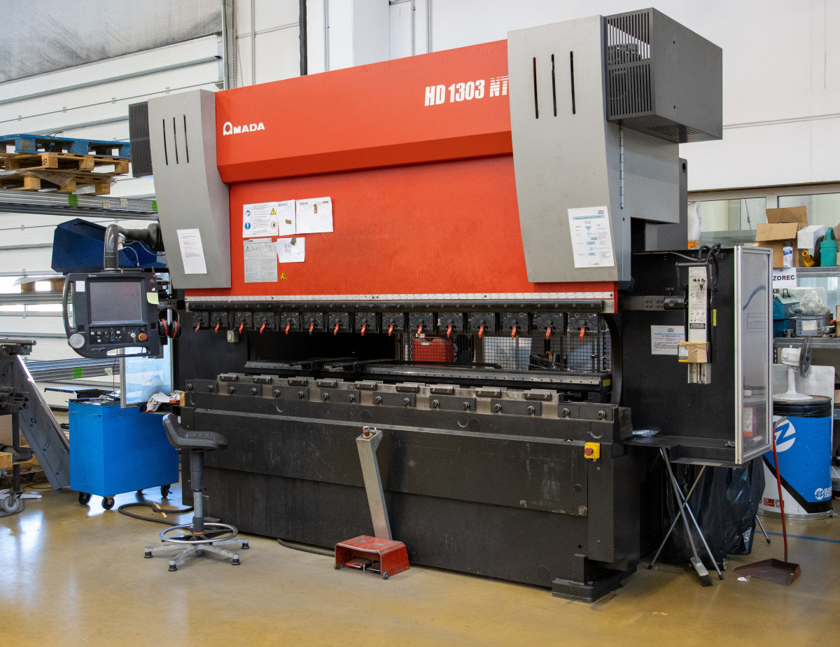 Za krivljenje pločevine uporabljamo dve CNC krivilni preši: večja Amada HD 1303 NT in manjša Bystronic Xpert80.